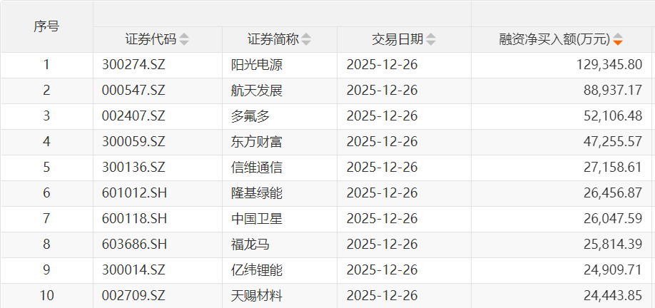 个股方面,28只股获融资净买入额超1亿元。阳光电源获融资净买入额居首,净买入12.93亿元;融资净买入金额居前的还有航天发展、多氟多、东方财富、信维通信、隆基绿能、中国卫星、福龙马、亿纬锂能、天赐材料等。