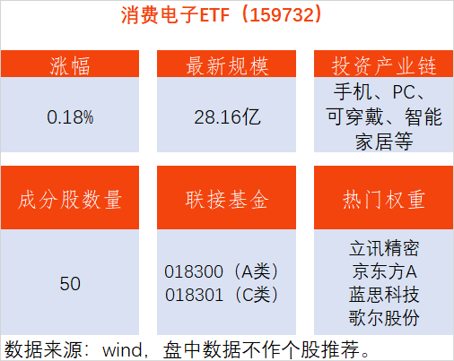 消费电子ETF(159732)跟踪国证消费电子指数,主要投资于业务涉及消费电子产业的50家A股上市公司,行业主要分布于电子制造、光学光电子等市场关注度较高的主流板块。其场外联接基金为,A类:018300;C类:018301。