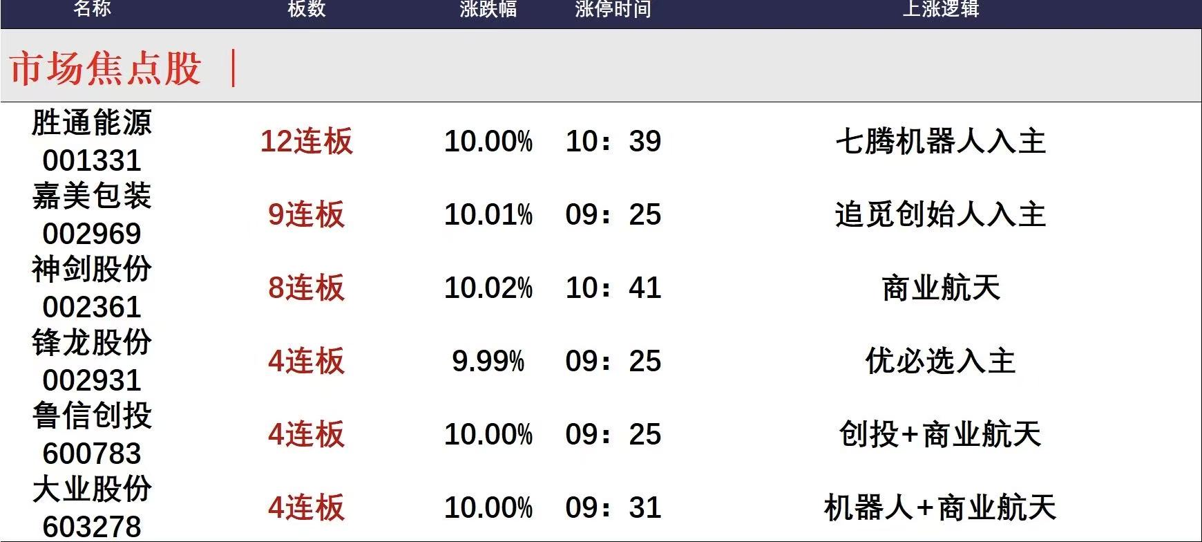 今日午盘全市场共53股涨停,连板股总数16只,24股封板未遂,封板率为69%(不含ST股、退市股)。焦点股方面,实控人变更的胜通能源12连板、嘉美包装9连板、锋龙股份4连板,商业航天概念股神剑股份8连板、鲁信创投4连板、大业股份4连板。