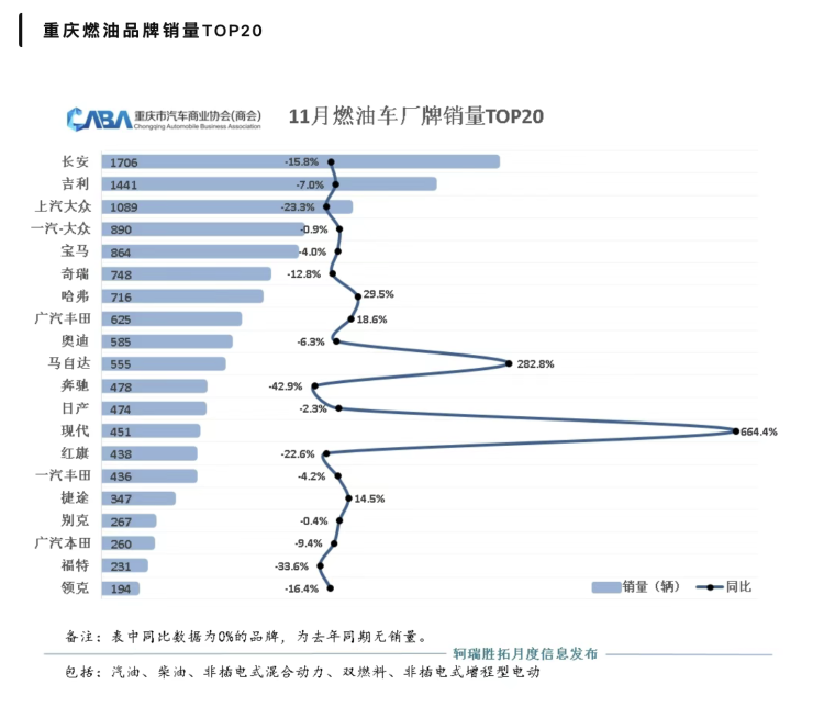 面对新能源猛烈浪潮,重庆燃油车市场持续低迷。但依然有品牌逆势增长。哈弗品牌销量716辆,同比增长29.5%;广汽丰田销量625辆,同比增长18.6%;捷途汽车销量347辆,同比增长14.5%,均属逆势增长的燃油车厂牌。