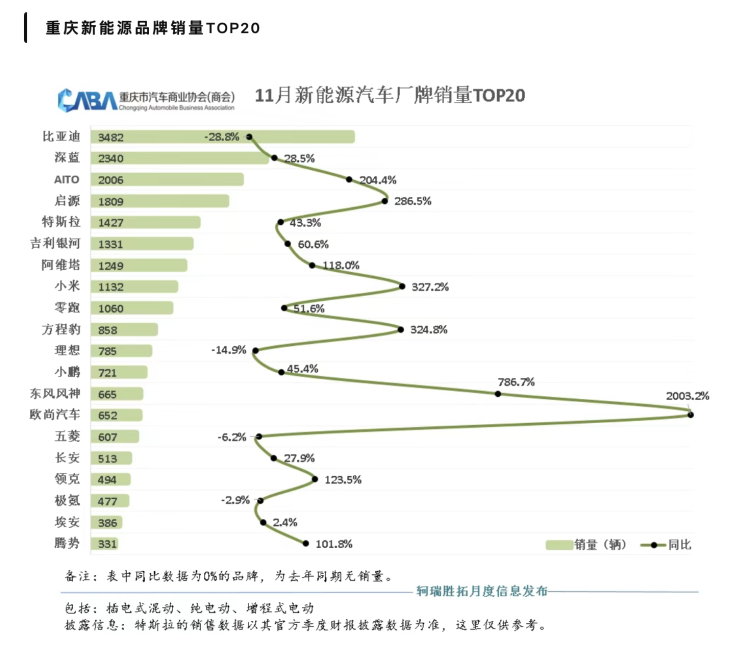 反观11月重庆新能源车市就显得非常鲜活。其中新能源汽车厂牌销量TOP20前三为比亚迪、深蓝、AITO,销量分别为3482辆、2340辆、2006辆。