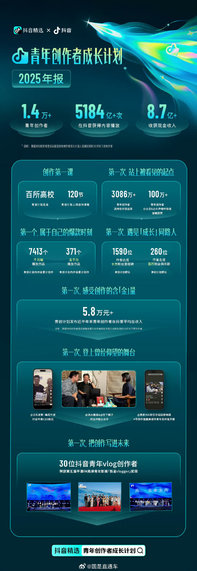内容创业成为越来越多年轻人的职业新选择。记者29日从抖音获悉,2025年,有1.4 万名青年创作者通过其精选青年创作者成长计划获得超 8 亿元现金收入,作品累计播放量突破 5000 亿次,260 位作者跻身“百万粉丝俱乐部”,1590 人粉丝量破十万。 这项由教育部学生服务与素质发展中心指导、联动全国百所高校的成长计划,自2025年7月开始试运营。