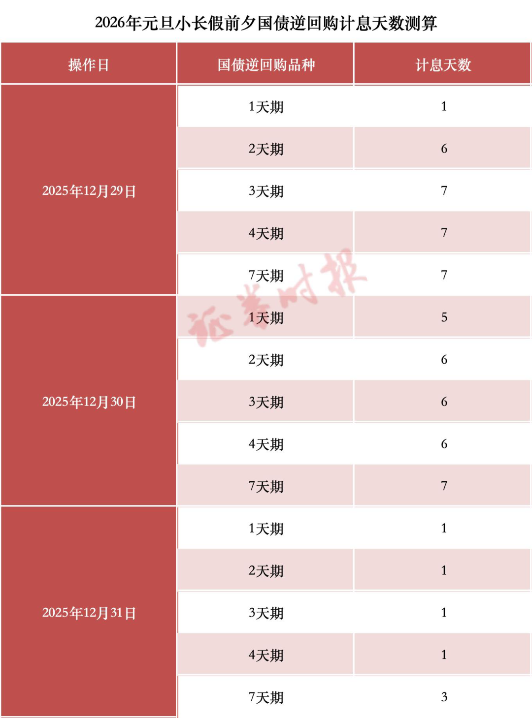 根据沪深交易所国债逆回购计息规则测算,今天(2025年12月29日)和明天(2025年12月30日)或是本次小长假前较好的国债逆回购操作时间窗口,能享受相对较多的计息天数,其中在今天操作3天期至7天期的国债逆回购,计息天数均达到7天。
