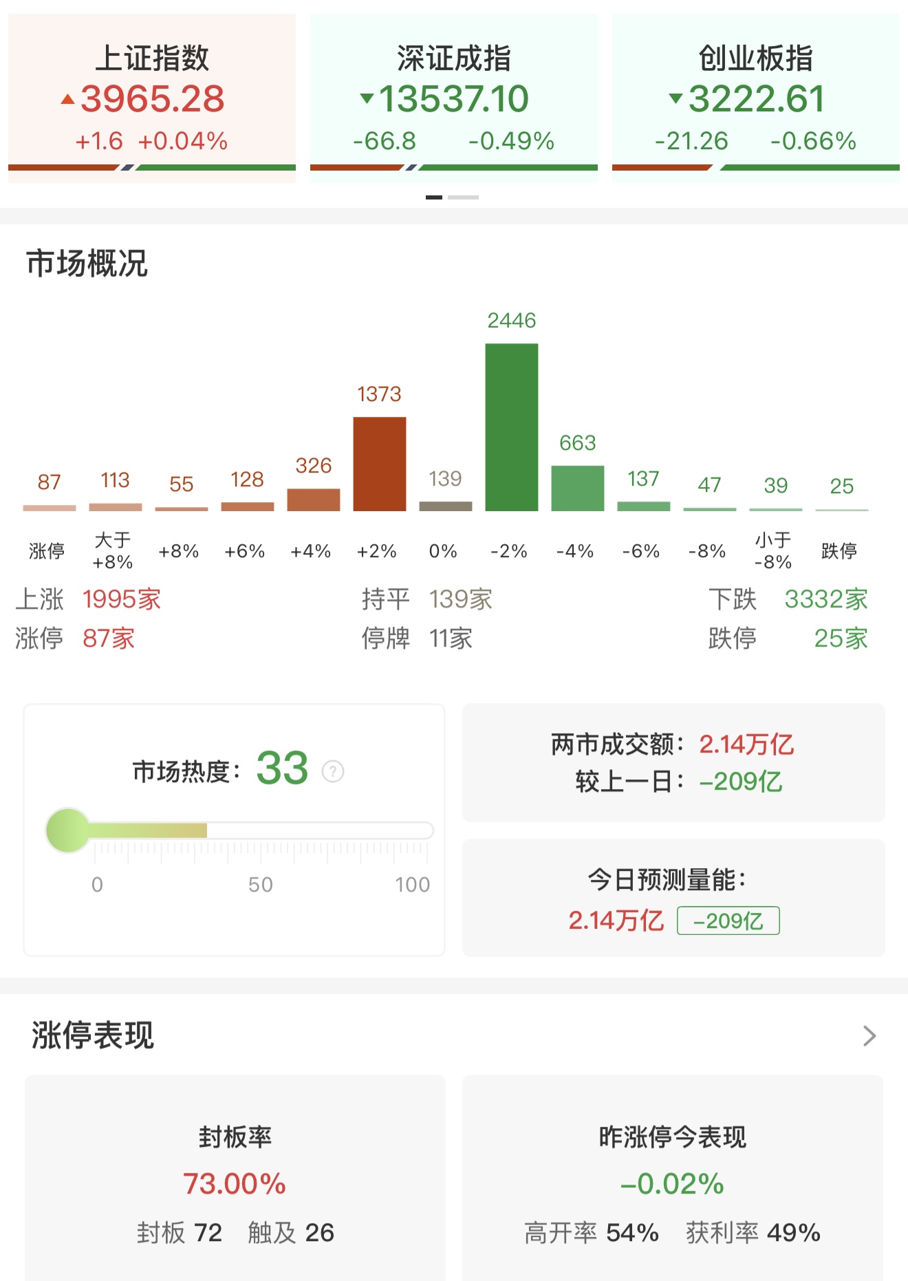 财联社12月29日电,三大指数涨跌不一,沪指微涨走出九连阳,创业板指一度跌超1%。沪深两市成交额2.14万亿,较上一个交易日缩量209亿。盘面上,全市场超3300只个股下跌。从板块来看,机器人概念午后反复活跃,步科股份20cm涨停创历史新高,五洲新春、模塑科技等多股涨停。商业航天概念延续强势,神剑股份8连板,金风科技、雷科防务等十余股涨停。碳纤维概念表现活跃,吉林化纤、和顺科技双双涨停。下跌方面,电池、乳业、电力等板块跌幅居前。其中电池概念午后震荡下挫,华盛锂电跌超7%。电力板块持续走弱,国电电力跌近8%。截至收盘,沪指涨0.04%,深成指跌0.49%,创业板指跌0.66%。