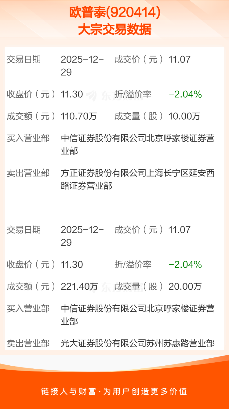 2025年12月29日,欧普泰发生2笔大宗交易,共成交30.00万股,成交金额332.10万元,占其流通市值比例为0.53%。