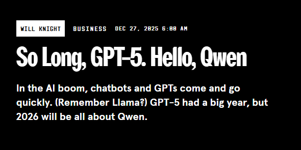 日前美国科技媒体《连线》(WIRED)发表头条文章《再见,GPT-5,你好,千问》,文章指出,GPT-5未能激起市场热情,而开源开放的阿里千问,性能优异,适于灵活部署应用,2026年将属于千问。“衡量任何AI模型价值的关键标准,不应仅限于其‘聪明’程度,更应看它被用于构建其他应用的广度。若以此为尺度,千问等中国开源大模型无疑正处于上升势头。”
