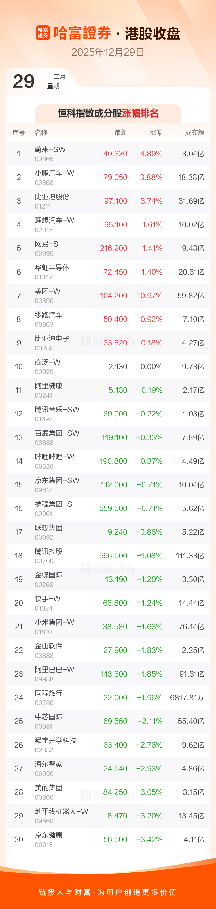 港股12月29日收盘走低 ,恒生指数收报25635.23点,跌183.7点,跌幅0.71%;恒生科技指数收报5483.01点,跌16.29点,跌幅0.3%。恒生指数成分股中比亚迪股份、吉利汽车、工商银行涨幅居前,金沙中国有限公司、京东健康、长和跌幅靠前。恒生科技指数成分股中蔚来-SW、小鹏汽车-W、比亚迪股份涨幅居前,京东健康、地平线机器人-W、美的集团跌幅靠前。