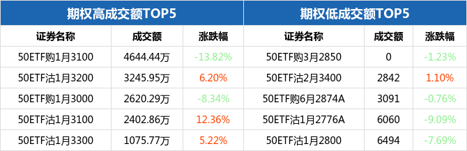 从成交额来看,50ETF期权合约中,50ETF购1月3100成交额最高,为4644.44万元,全日下跌13.82%,报收0.0505元;而最低的为50ETF购3月2850,成交额为0元,全日下跌1.23%,报收0.29元。