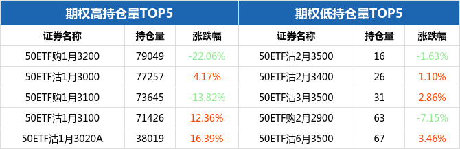 从持仓量来看,50ETF期权合约中,50ETF购1月3200持仓量最大,为79049张,期权全日下跌22.06%,报收0.0159元;持仓量最小的为50ETF沽2月3500,共计16张,期权全日下跌1.63%,报收0.3738元。