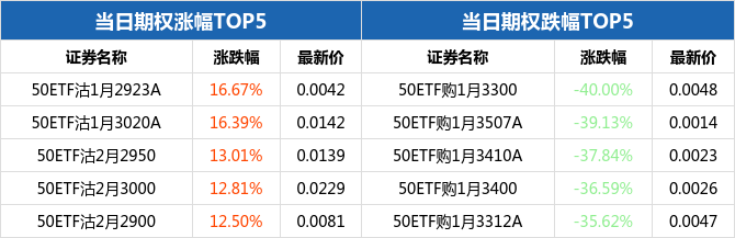 上证上证50ETF收跌,50ETF沽1月2923A涨幅16.67%