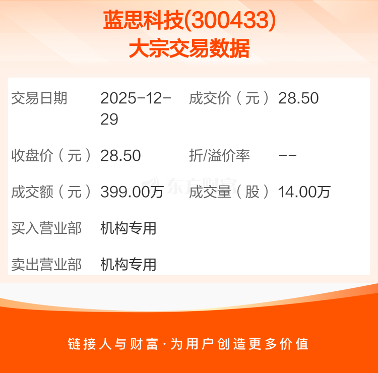 大宗交易:蓝思科技成交399.00万元(12-29)