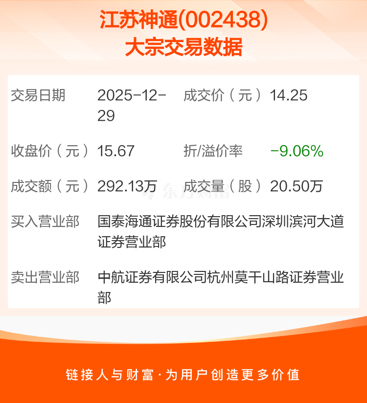 2025年12月29日,江苏神通发生1笔大宗交易,共成交20.50万股,成交金额292.13万元,占其流通市值比例为0.04%。