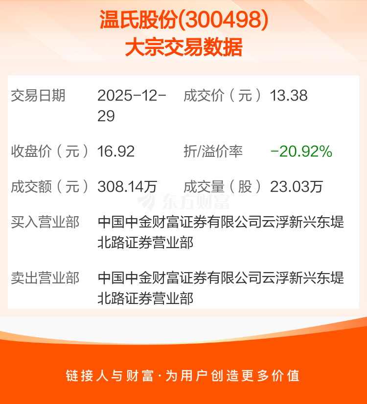 大宗交易:温氏股份成交308.14万元,折价20.92%(12-29)