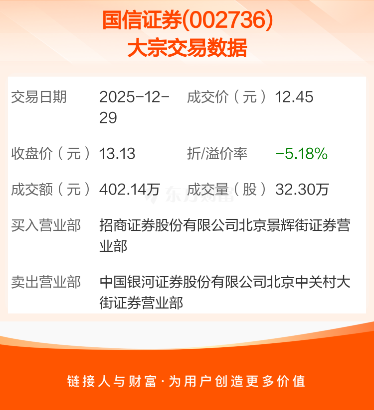 大宗交易:国信证券成交402.14万元,折价5.18%(12-29)