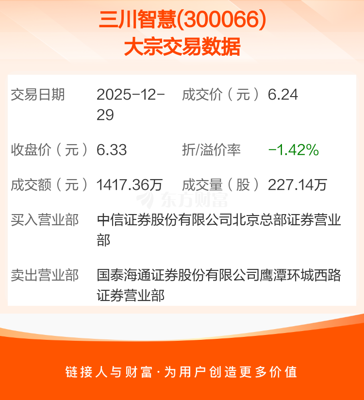 大宗交易:三川智慧成交1417.36万元,折价1.42%(12-29)
