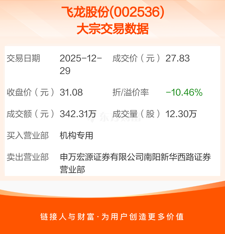 大宗交易:飞龙股份成交342.31万元,折价10.46%(12-29)