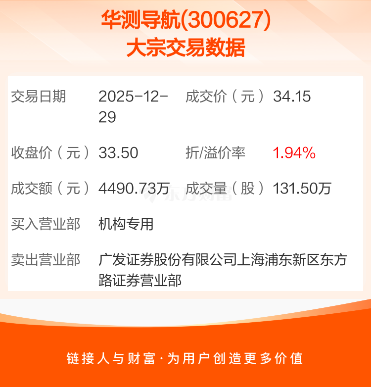 大宗交易:华测导航成交4490.73万元,溢价1.94%(12-29)