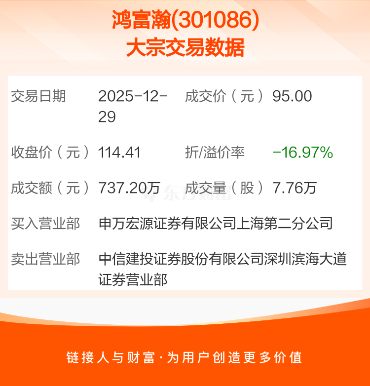 大宗交易:鸿富瀚成交737.20万元,折价16.97%(12-29)