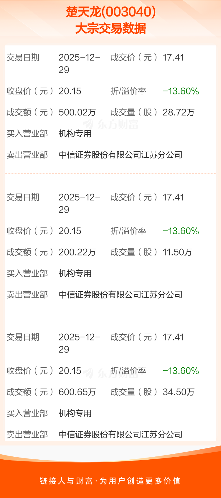2025年12月29日,楚天龙发生3笔大宗交易,共成交74.72万股,成交金额1300.89万元,占其流通市值比例为0.14%。