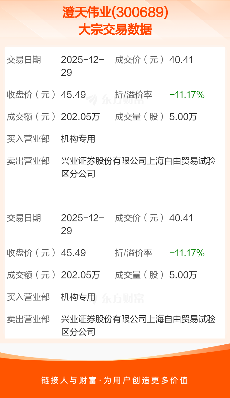 2025年12月29日,澄天伟业发生2笔大宗交易,共成交10.00万股,成交金额404.10万元,占其流通市值比例为0.09%。