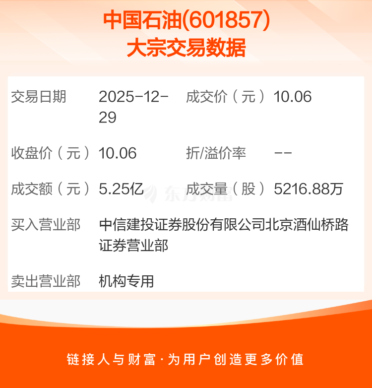 2025年12月29日,中国石油发生1笔大宗交易,共成交5216.88万股,成交金额5.25亿元,占其流通市值比例为0.03%。