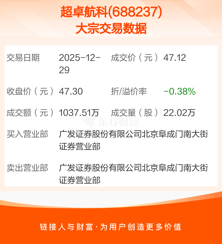 2025年12月29日,超卓航科发生1笔大宗交易,共成交22.02万股,成交金额1037.51万元,占其流通市值比例为0.24%。