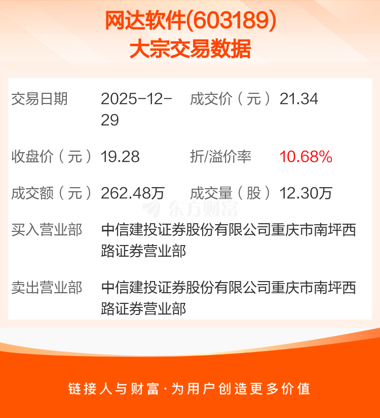 大宗交易:网达软件成交262.48万元,溢价10.68%(12-29)