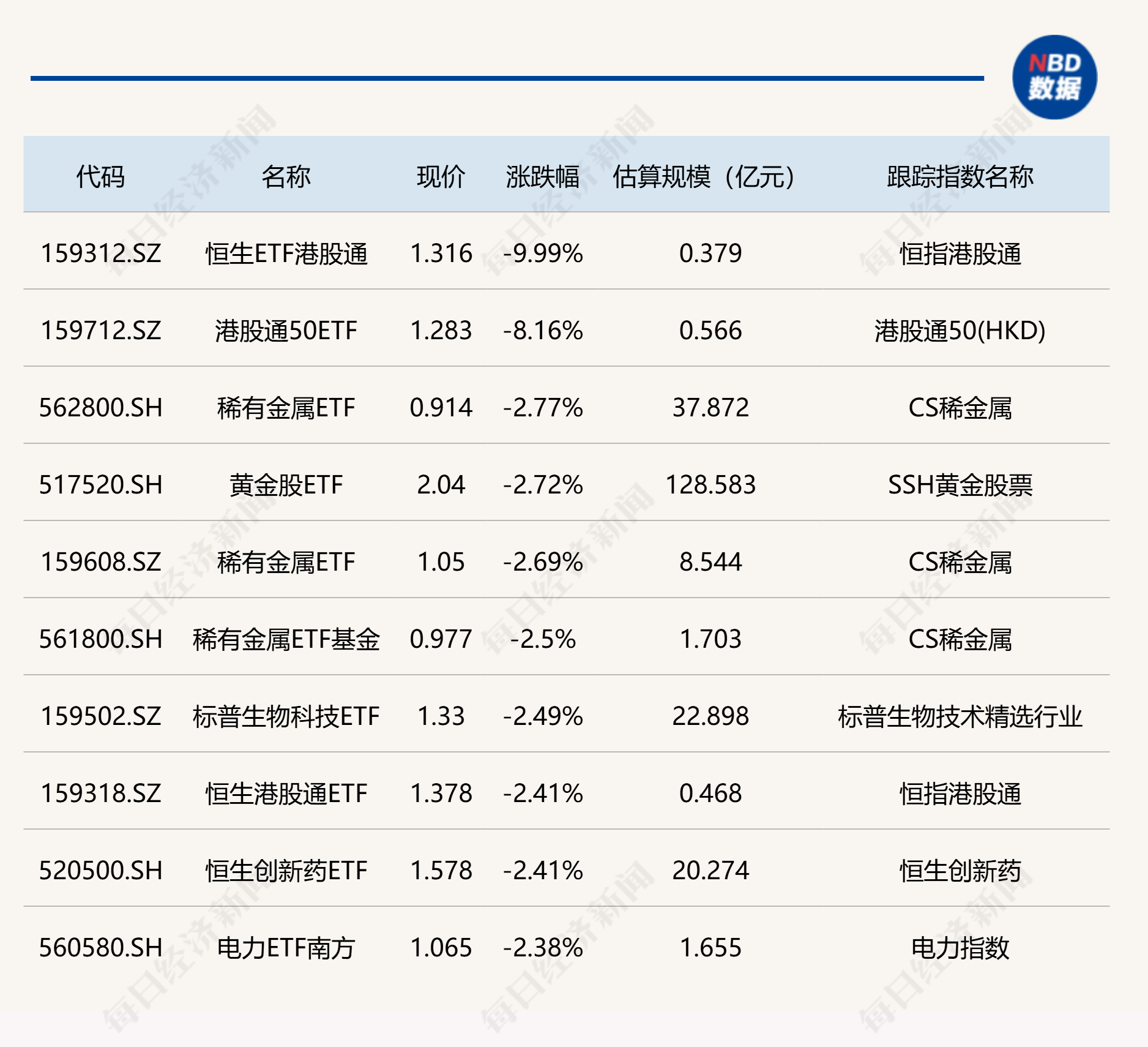 下跌方面,恒生ETF港股通跌停,港股通50ETF跌超8%。