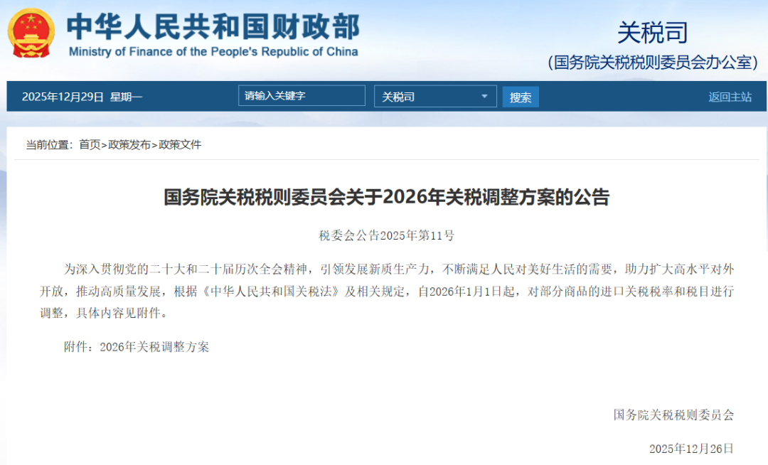 据财政部网站12月29日消息,国务院关税税则委员会发布《2026年关税调整方案》(简称《方案》)。《方案》称,为深入贯彻党的二十大和二十届历次全会精神,引领发展新质生产力,不断满足人民对美好生活的需要,助力扩大高水平对外开放,推动高质量发展,根据《中华人民共和国关税法》及相关规定,自2026年1月1日起,对部分商品的进口关税税率和税目进行调整。