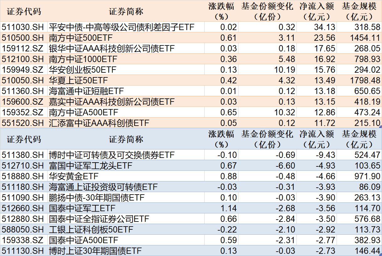与此同时,博时中证可转债及可交换债券ETF份额减少0.69亿份,净流出额9.43亿元;富国中证军工龙头ETF份额减少6.60亿份,净流出额4.93亿元;华安黄金ETF份额减少0.48亿份,净流出额4.66亿元。