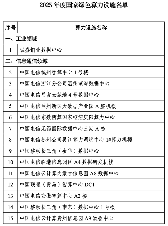 工信部等六部门确定了2025年度国家绿色算力设施名单,现予以公告。