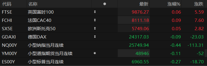 周一盘前,美股三大股指期货齐跌,欧洲主要指数多数上涨。截至发稿,纳斯达克100指数期货跌0.44%,道指期货跌0.11%,标普500指数期货跌0.27%。