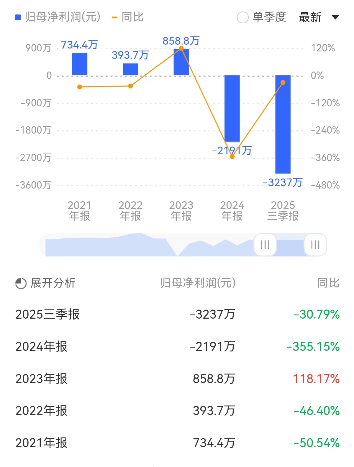 财务数据显示,2023年公司归母净利润为858.82万元,勉强实现盈利;但2024年业绩骤然变脸,归母净利润亏损2191.26万元,同比降幅达355.15%;进入2025年,盈利状况并未改善,前三季度归母净利润亏损3237.34万元,同比下降30.79%。