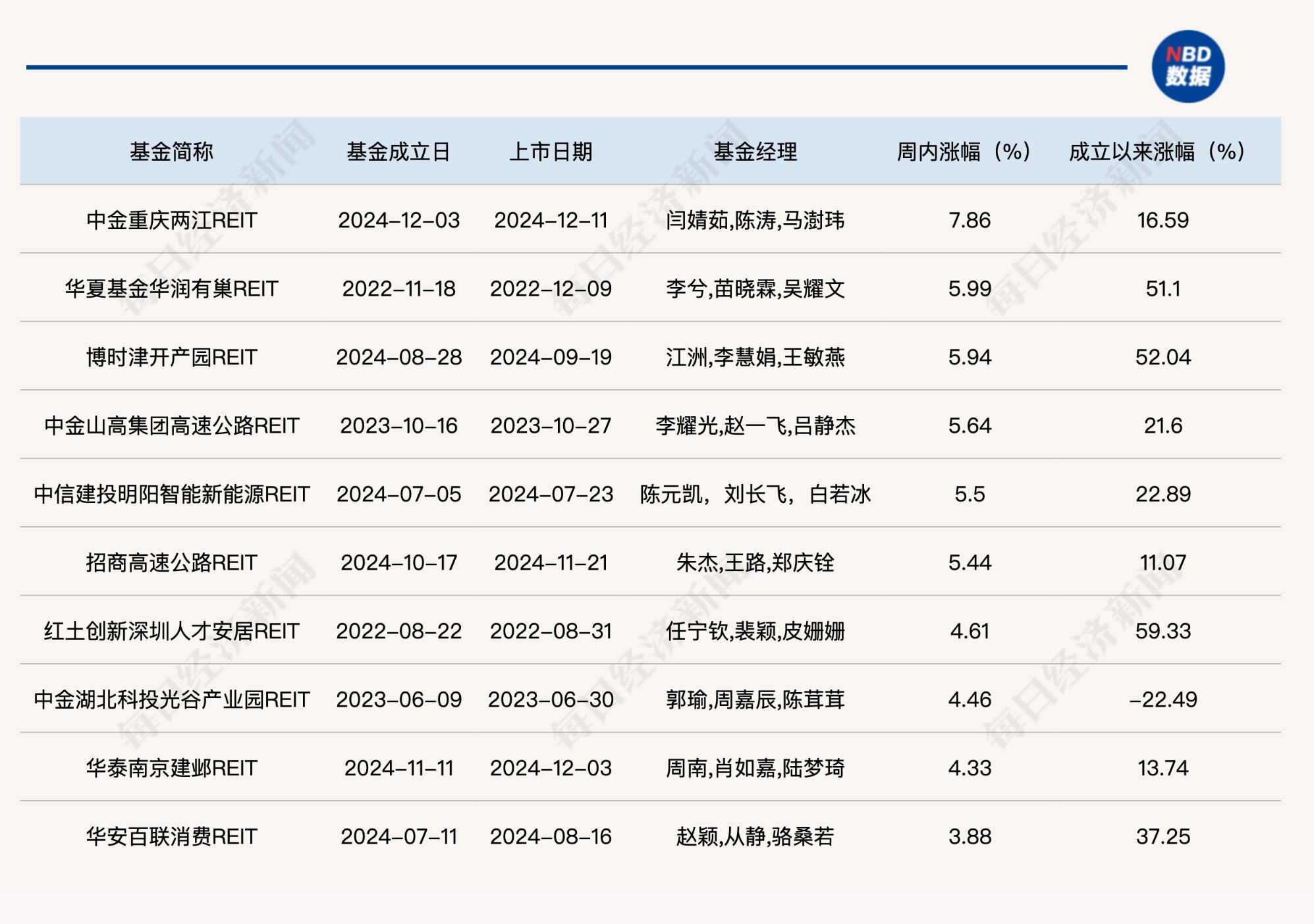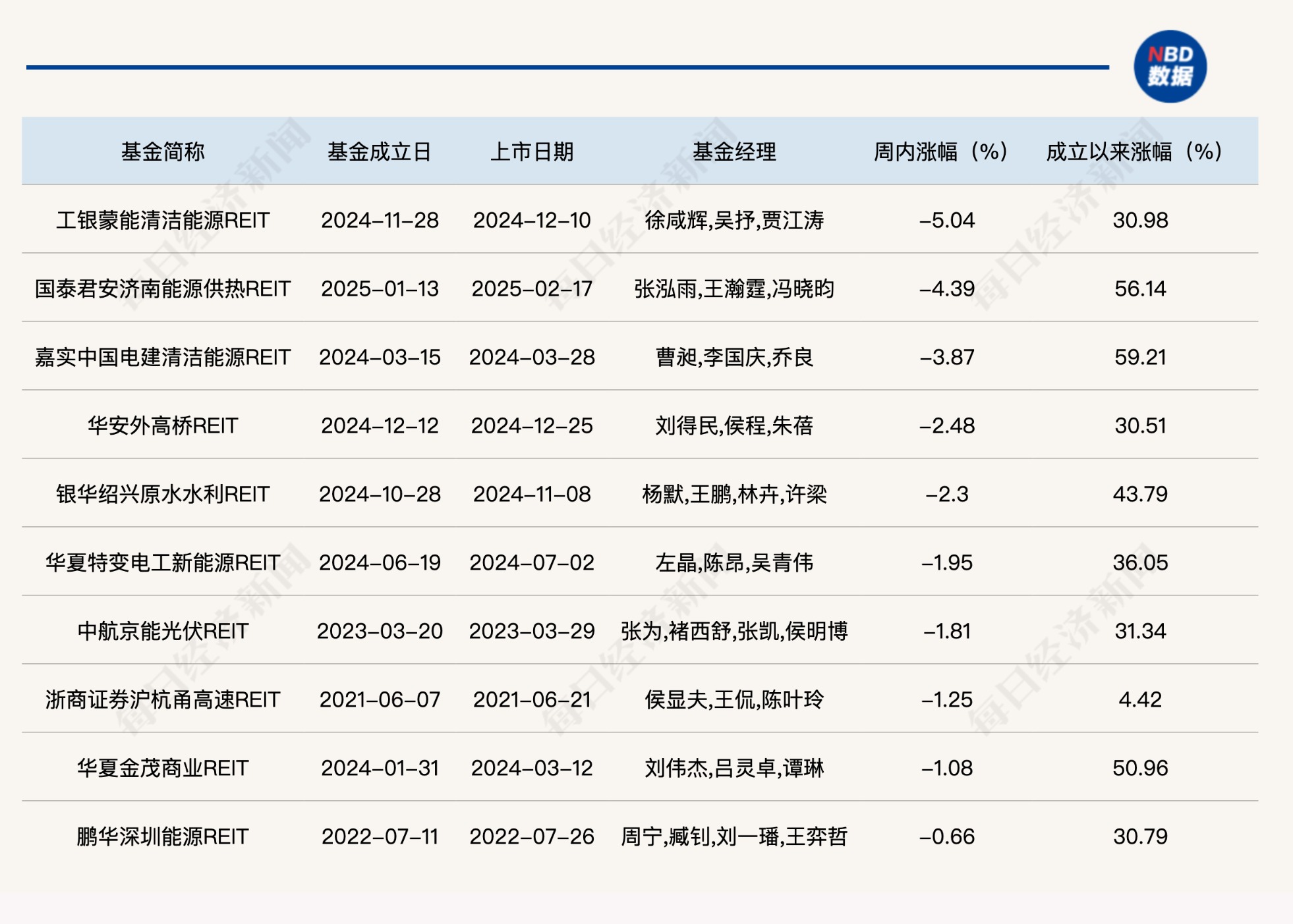 环比下跌的也减少至11只。跌幅最大的三只产品分别是工银蒙能清洁能源REIT、国泰君安济南能源供热REIT和嘉实中国电建清洁能源REIT,上周分别下跌了5.04%、4.39%和3.87%。