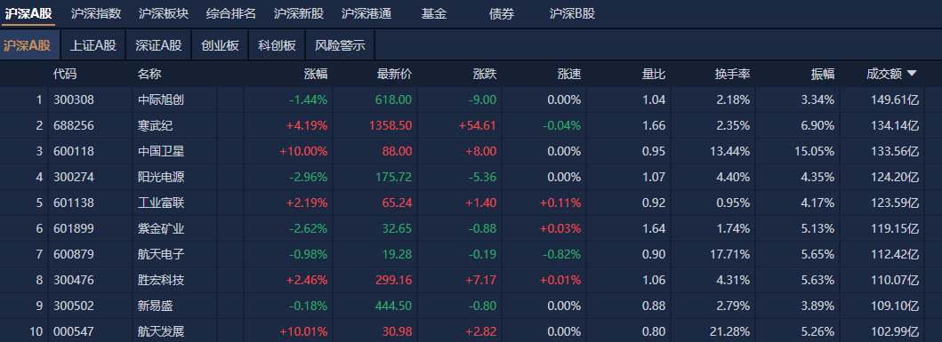 沪深两市成交额2.14万亿,较上一个交易日缩量209亿。个股方面,中际旭创全天成交额近150亿元居首,寒武纪、中国卫星、阳光电源等个股成交额排名靠前。