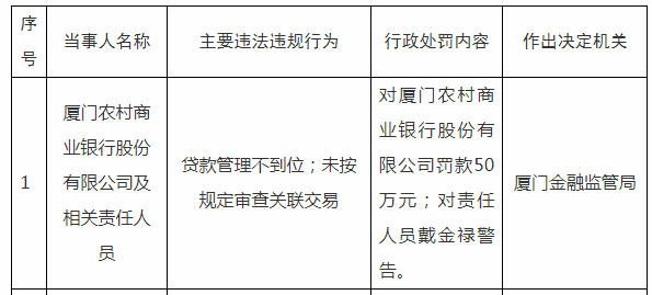 近日,国家金融监督管理总局厦门监管局披露行政处罚信息,因贷款管理不到位、未按规定审查关联交易,对厦门农村商业银行股份有限公司罚款50万元;同时,对责任人员戴金禄警告。