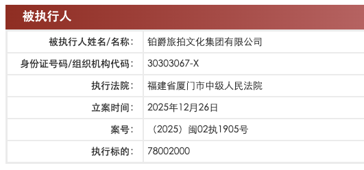 中国执行信息公开网显示,12月26日,铂爵旅拍文化集团有限公司、许春盛等新增一则被执行人信息,执行标的7800.2万人民币,执行法院为福建省厦门市中级人民法院。