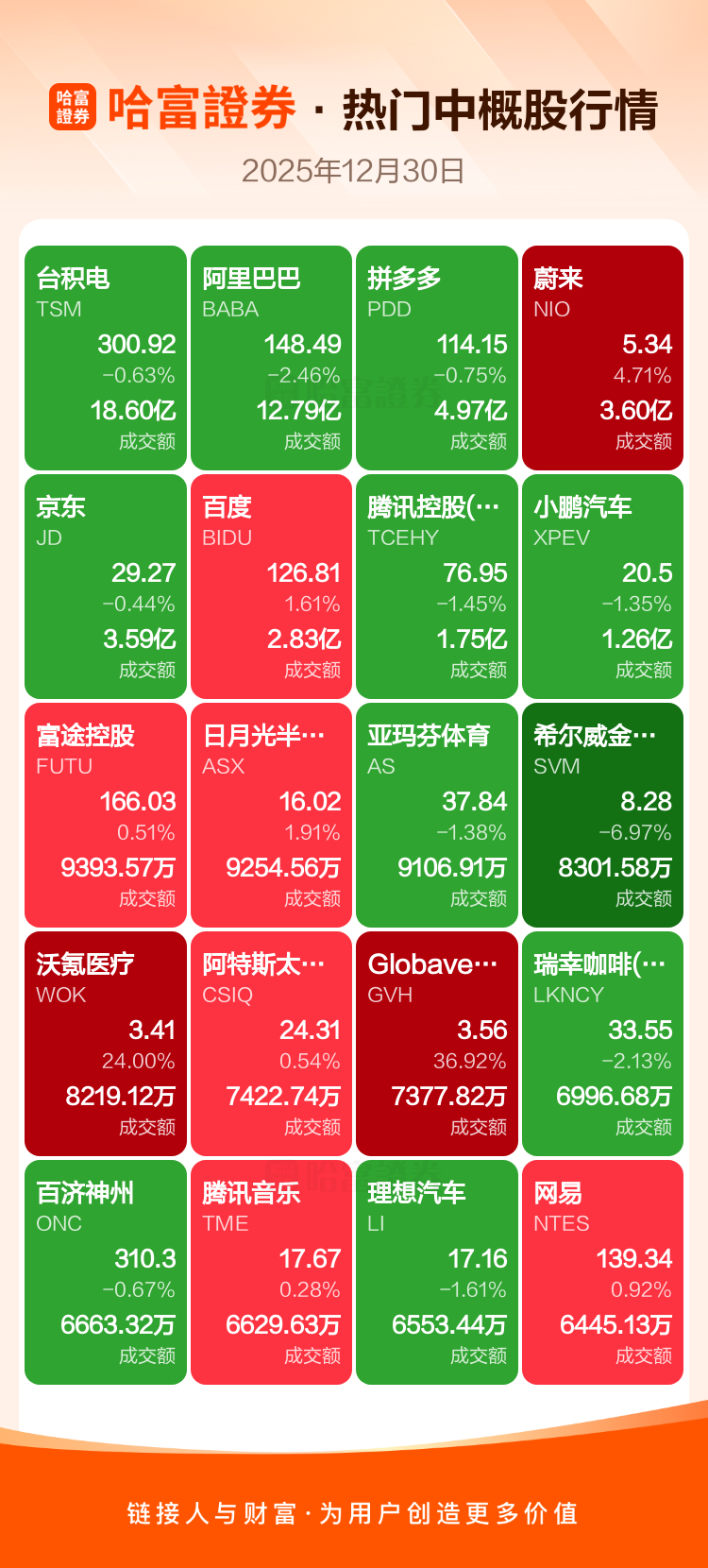 台积电跌0.63%,阿里巴巴跌2.46%,拼多多跌0.75%,蔚来涨4.71%,京东跌0.44%,百度涨1.61%,腾讯控股(ADR)跌1.45%,小鹏汽车跌1.35%,富途控股涨0.51%,日月光半导体涨1.91%。