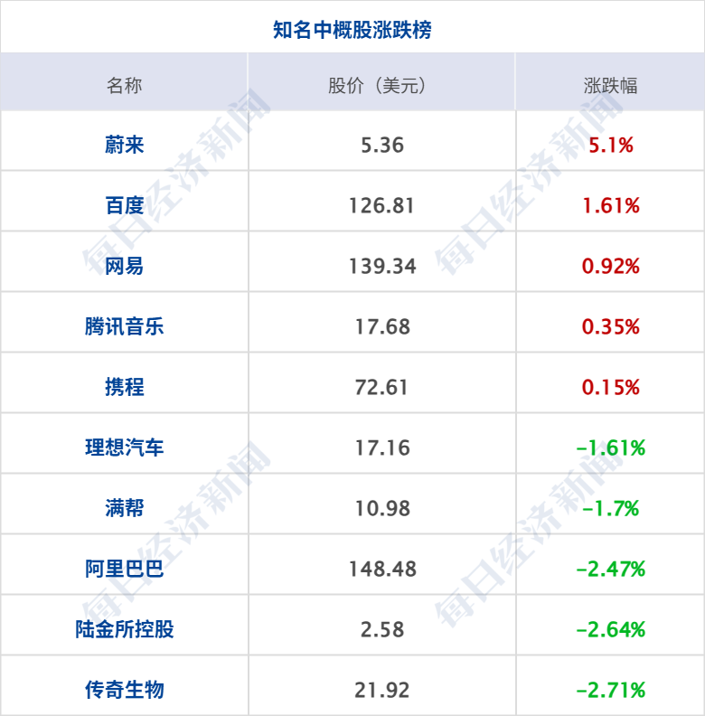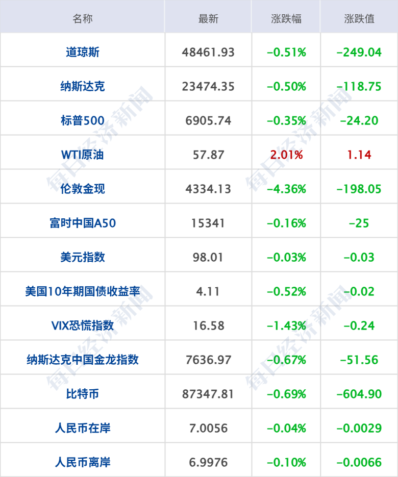 美股三大指数均小幅收跌,道指跌0.51%,纳指跌0.5%,标普500指数跌0.35%;大型科技股多数下跌,特斯拉跌超3%,英伟达跌超1%,微软、奈飞、亚马逊、Meta小幅下跌;英特尔涨超1%,苹果、谷歌小幅上涨;贵金属板块跌幅居前,哈莫尼黄金跌超8%,泛美白银、金罗斯黄金跌超5%。纳斯达克中国金龙指数跌0.67%,中概股多数下跌,蔚来涨超5%,爱奇艺、百度涨超1%;阿里巴巴跌超2%,名创优品跌近2%,哔哩哔哩跌超1%。