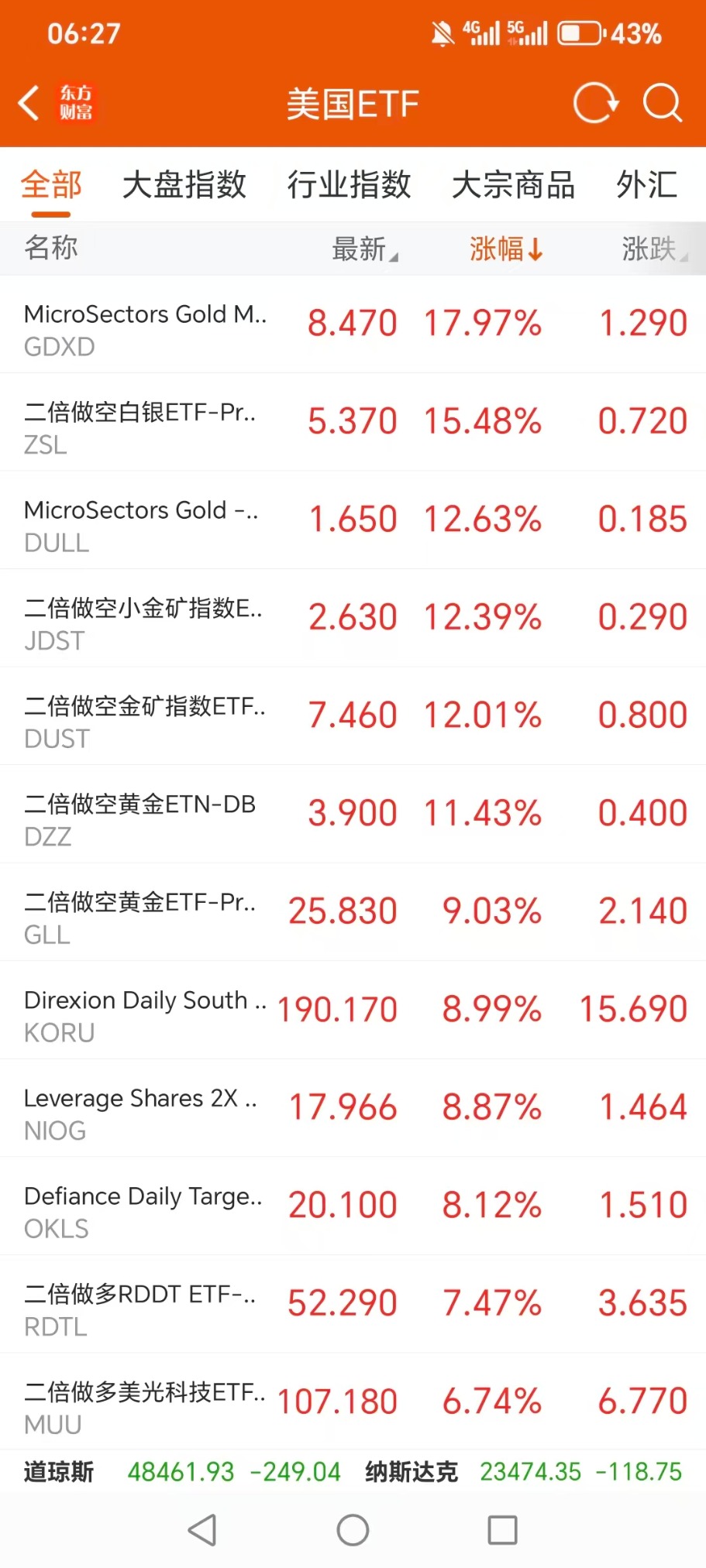 德银黄金两倍做空ETN(DZZ.US) 升6.29%,成交额61.51万美元。