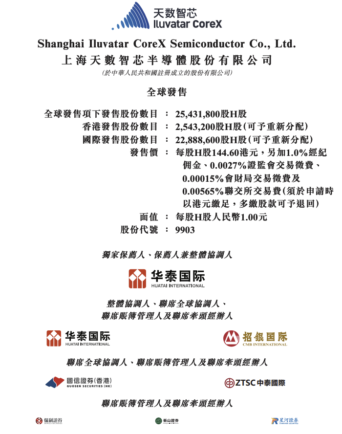 天数智芯:拟全球发售2543.18万股H股,发售价144.60港元