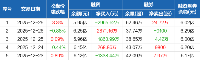 南京银行:融资净偿还2965.62万元,融资余额5.95亿元(12-29)
