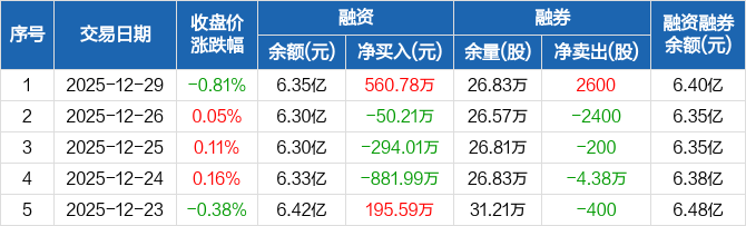 华润双鹤:融资净买入560.78万元,融资余额6.35亿元(12-29)