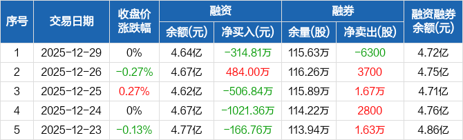 雅戈尔:融资净偿还314.81万元,融资余额4.64亿元(12-29)