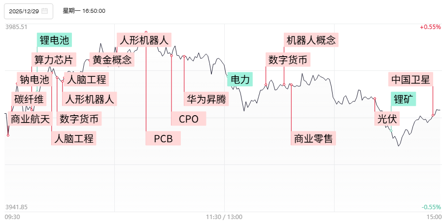 财联社12月30日电,上个交易日三大指数涨跌不一,沪指微涨走出九连阳,创业板指一度跌超1%。全市场超3300只个股下跌。沪深两市成交额2.14万亿,较上周五缩量209亿。1)12月26日,上交所对商业火箭企业适用科创板第五套上市标准作出细化规定,商业航天概念受此消息再度爆发,神剑股份等多股实现连板晋级,中国卫星股价创历史新高,总市值突破1000亿,趋势抱团股超捷股份、昊志机电、航天环宇等亦刷新历史高点,多波形态龙头航天发展也逼近2021年初高点。2)12月27日,工信部人形机器人与具身智能标准化技术委员会成立会议在京召开。多重利好继续引爆机器人概念,叠加股权转让的胜通能源、嘉美包装、锋龙股份均实现连板晋级,带动板块内20厘米套利标的大面积向上加速,已经获得智元机器人入主的人气股上纬新材触及涨停,创历史新高,趋势股斯菱智驱、五洲新春也双双刷新历史高点。3)四季度以来算力国产化的积极进展,刺激算力芯片概念走强,获中昊芯英要约收购的天普股份涨停续创历史新高,芯原股份一度涨超10%,云天励飞、寒武纪等也一度大幅冲高。此外算力硬件股盘中也一度大幅冲高,源杰科技、鼎泰高科、东山精密等一度创历史新高,但最终震荡回落收出长上影线。4)央行最新出台了《关于进一步加强数字人民币管理服务体系和相关金融基础设施建设的行动方案》,该《行动方案》将于2026年1月1日起正式启动实施。数字货币概念受此提振展开像样拉升,御银股份、翠微股份涨停,拉卡拉收涨超10%,恒宝股份尾盘一度触及涨停。
