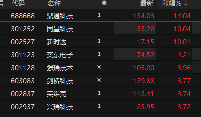 上证报中国证券网讯 12月30日早盘,液冷概念拉升。9时39分,鼎通科技涨超14%,同星科技涨超10%,新时达、奕东电子等跟涨。