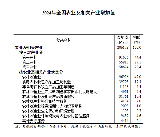 经核算,2024年全国农业及相关产业增加值为206173亿元,占国内生产总值(GDP)的比重为15.29%。