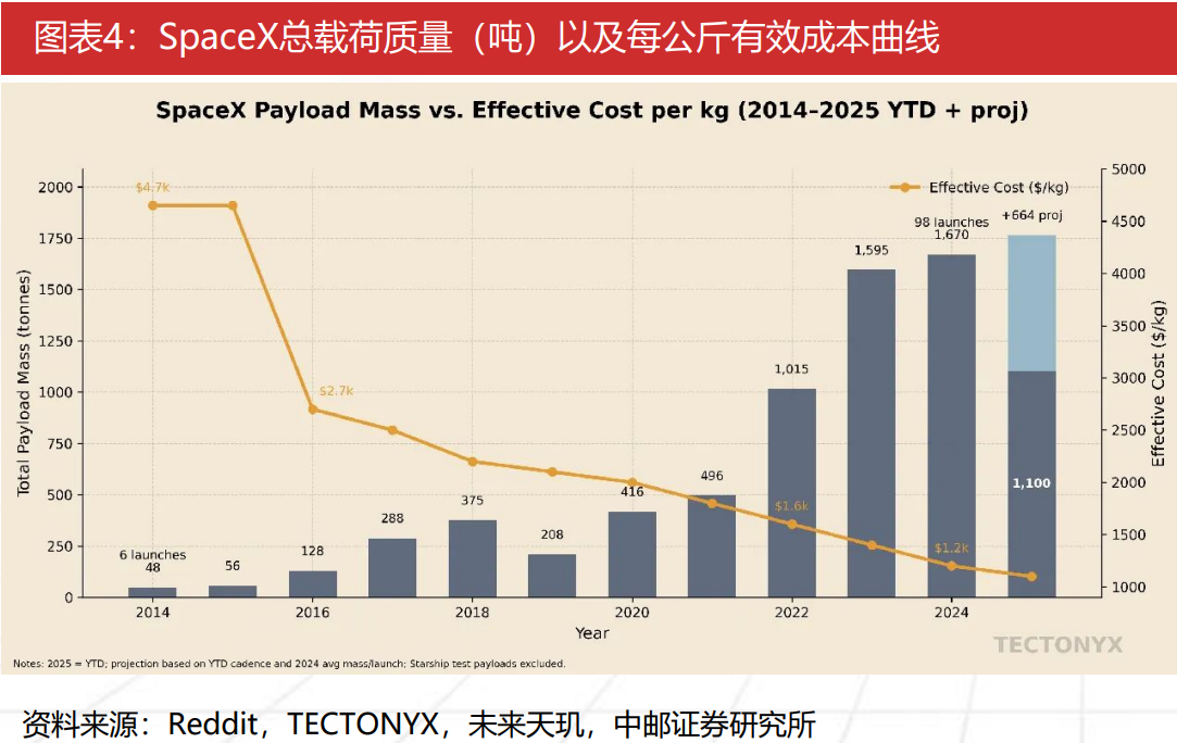 以此计算,一颗500公斤级的卫星,发射费用最高可能达到7500万元,而随着卫星研制技术的成熟与成本优化,部分500公斤级卫星的制造成本已可控制在5000万-6000万元。与之对比,SpaceX在可复用火箭、垂直整合与规模经济以及自家星链闭环加持下,猎鹰9号现已低于1500美元/kg,重型猎鹰约1400-1500美元/kg,而在研星舰目标直指100美元/kg,甚至67美元/kg运营底线,重新定义行业定价标准。