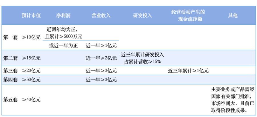 具体而言,第一套标准贴近传统盈利要求的标准,需满足预计市值不低于10亿元,近两年净利润累计不低于5000万元,或近一年净利润为正且营业收入不低于1亿元。第二套至第四套分别侧重于研发投入、现金流、市场规模,市值要求逐级提高,其他财务指标则相应多元化或放宽。