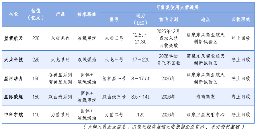 21世纪经济报道记者咨询多位业内专家得知,目前业内除极个别公司型号外,液体火箭基本都算中型及以上,上述5家企业的可回收型号也满足该条件。